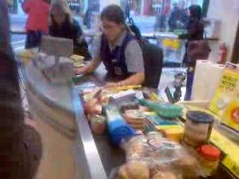 Bom, chegando na hora de pagar, você coloca na esteira, e agora você tem que se muito rápido. Digo muito rápido mesmo, na hora que a sua compra vai ser processada, o cara não para, e você já tem que ir pegando as compras do outro lado e colocando na sacola, e já estar com o dinheiro separado pra pagar o caixa logo que ele terminar. Gente, isso é muito pouco tempo, estou a 3 meses aqui e ainda odeio ir no mercado e comprar mais que consigo pegar em duas mãos, porque não dá tempo, e se você se "enrola", a galera de trás da fila já fica nervosa. Ah, para separar as compras de cada cliente, há uma barrinha que você pega ali do lado da esteira e coloca depois da sua compra, aí o próximo pode por as dele. Aqui segue um vídeo de como é, hehe, esse é mais rápido que o normal, tá bom, mas essa é a ideia.